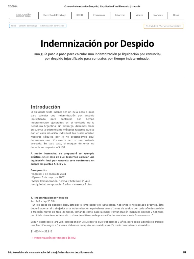 Calculo Indemnizacion Despido Liquidacion Final Renuncia Laboralis Pdf Salario Liquidacion